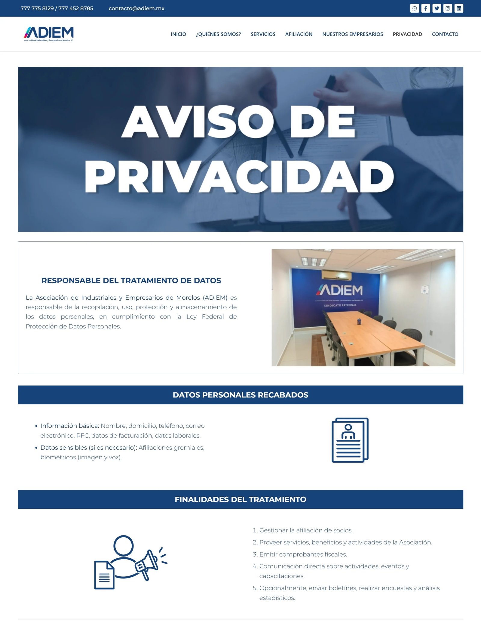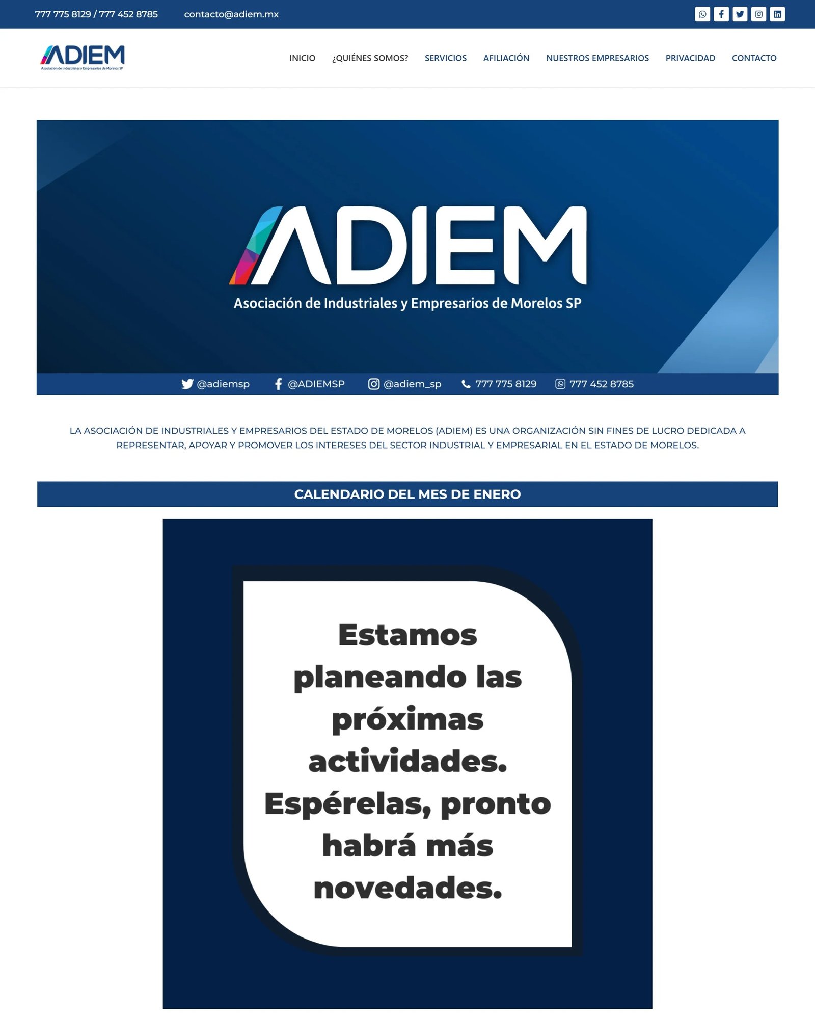 Durante mis prácticas profesionales en ADIEM, participé en la administración y mejora de su sitio web institucional. Una de mis principales aportaciones fue el desarrollo del apartado de política de privacidad, así como mejoras en la interfaz de la página de inicio para hacerla más clara y accesible para los usuarios.