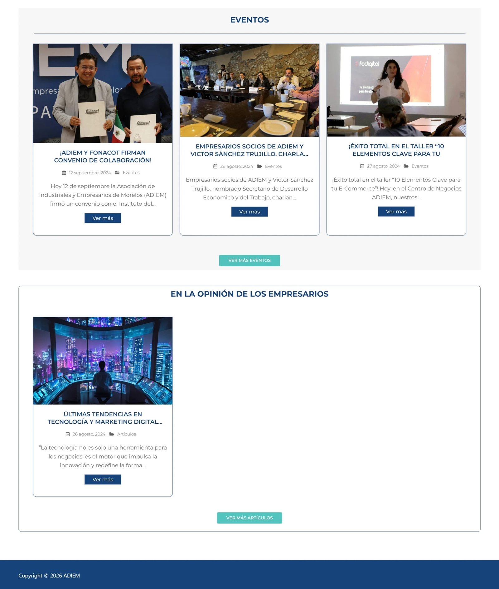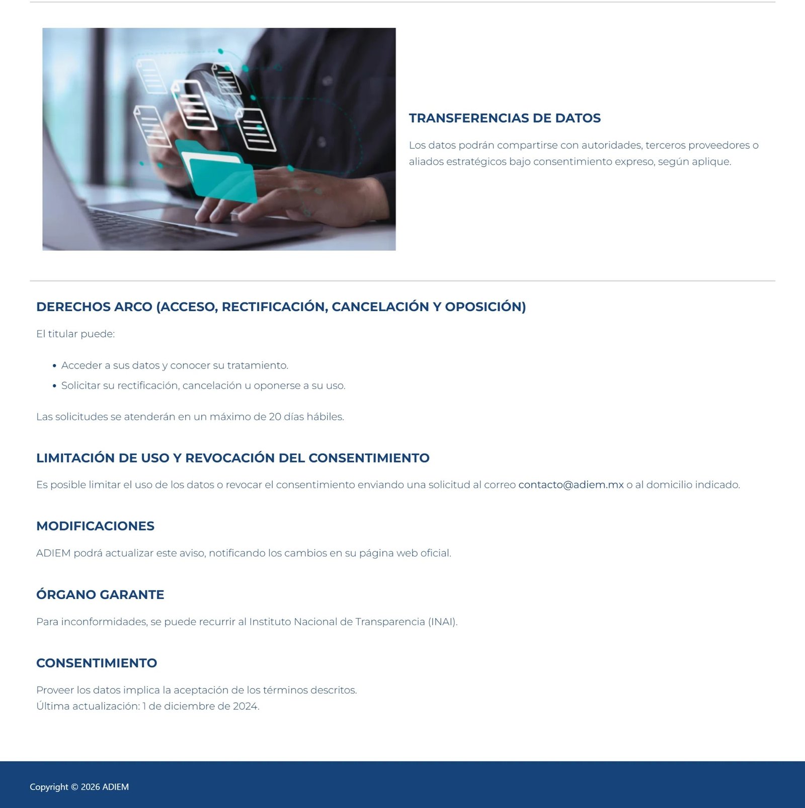 Durante mis prácticas profesionales en ADIEM, participé en la administración y mejora de su sitio web institucional. Una de mis principales aportaciones fue el desarrollo del apartado de política de privacidad, así como mejoras en la interfaz de la página de inicio para hacerla más clara y accesible para los usuarios.